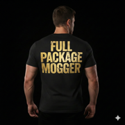 The "FULL PACKAGE MOGGER" text is printed on the back in bold distressed lettering. The front is clean black — no logo, no design. Lets the back do the talking.